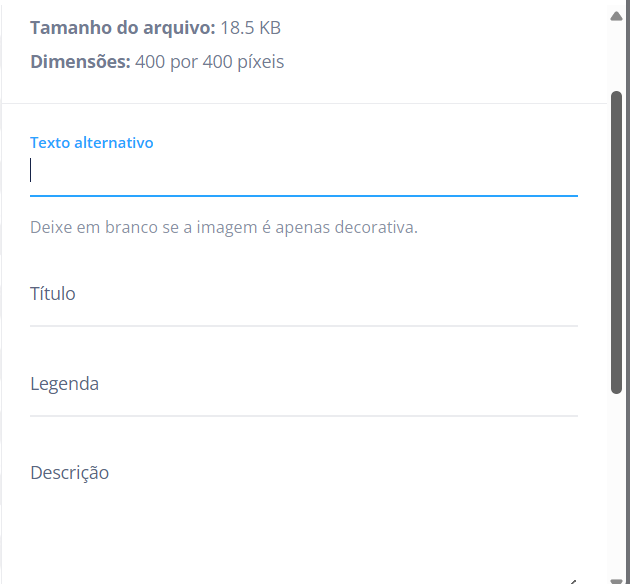 - Texto alternativo, título, legenda e descrição (campos complementares)