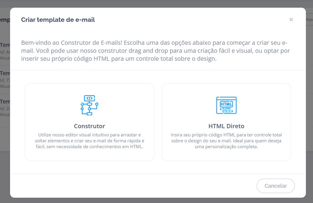 - Construtor: Possui elementos de arrastar e soltar para facilitar a criação do template.