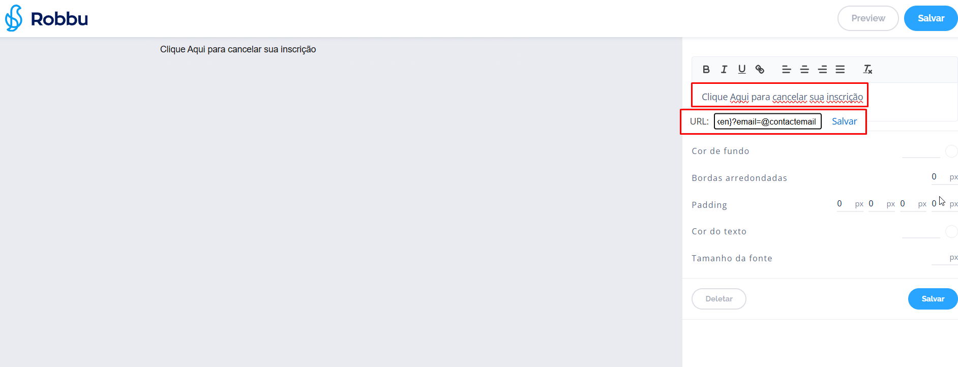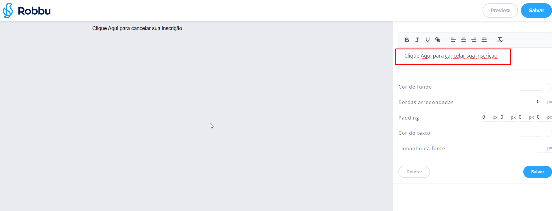 - Digite o texto desejado e utilize uma palavra-chave para vincular o link de cancelamento.
