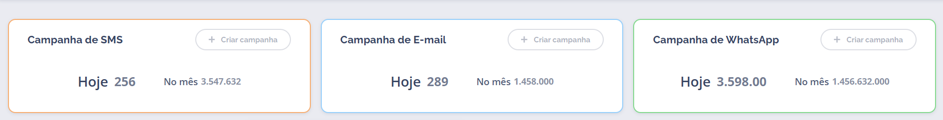 No topo do dashboard, há um painel dedicado ao acompanhamento de campanhas em tempo real, com foco nos canais SMS, E-mail e WhatsApp. Para cada canal, são exibidos os seguintes contadores:- Contatos realizados hoje