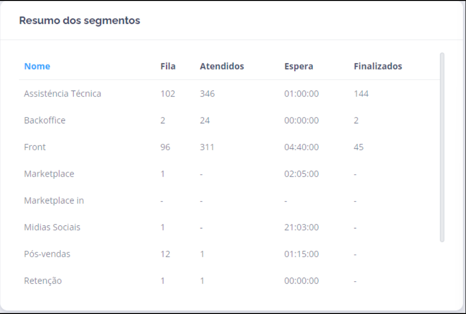 A tabela de Resumo dos Segmentos apresenta o desempenho por segmento (carteira ou fila). Esse painel permite:- Detectar gargalos por tipo de atendimento;