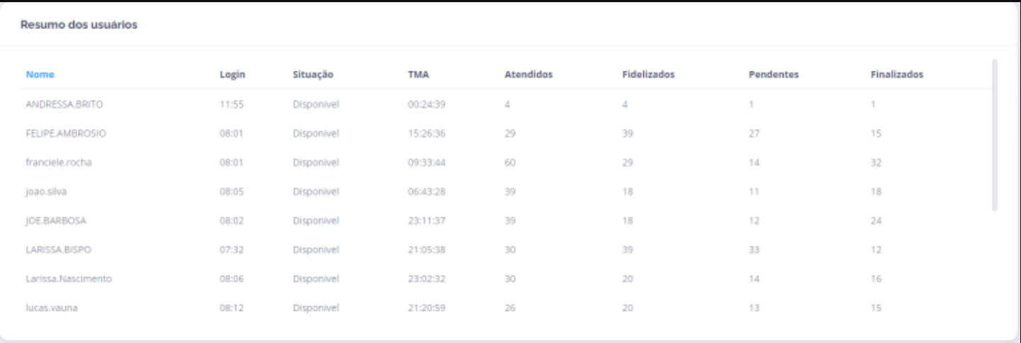 Sim. Existe uma aba de Resumo dos Usuários com os dados por atendente.