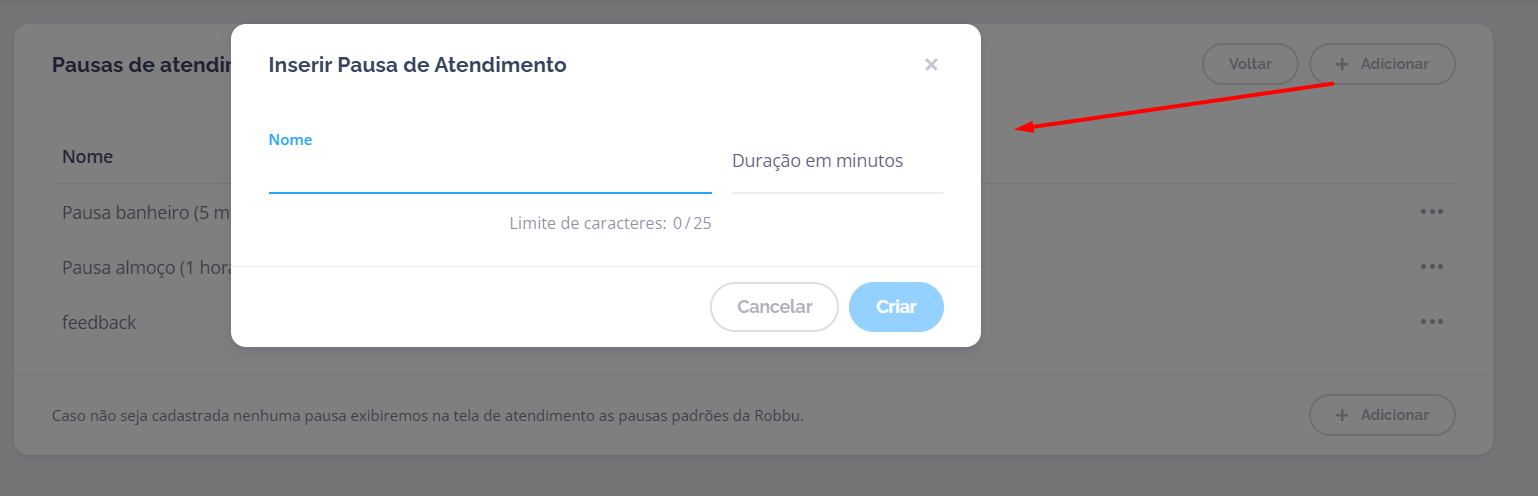 Configurações > Pausas de Atendimento. - Clique em + Adicionar.