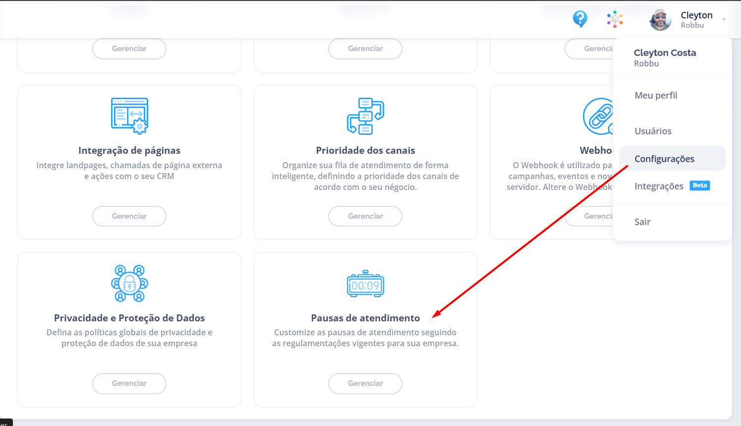 - No canto superior direito, clique no menu do usuário.