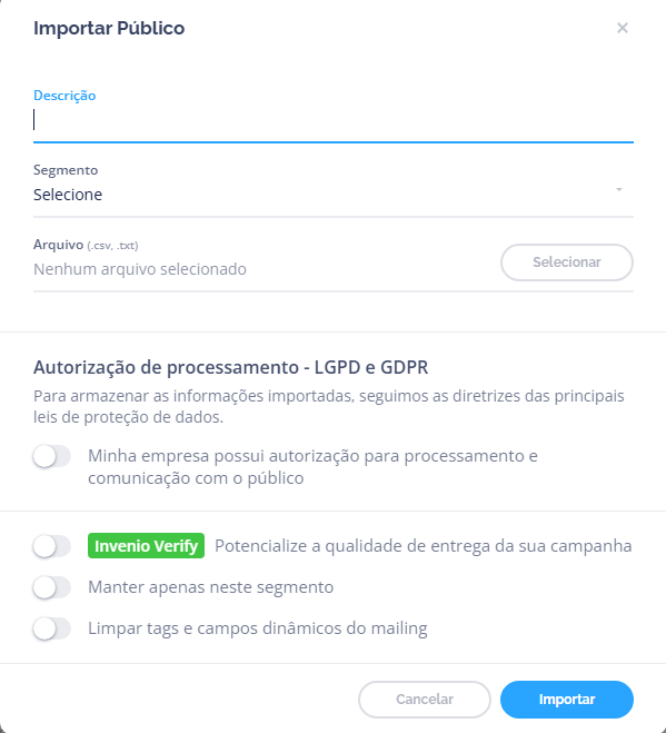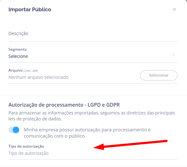 Para realizar a importação do seu público basta seguir o passo a passo abaixo: Descrição: Defina o nome do público Segmento: Selecione o segmento que aquele público faz parte Arquivo: Faça o upload do aquivo preenchido Autorização de processamento - LGPD e GDPR Escolha a opção que mais se adequa a autorização que sua empresa possui para lidar com estes dados sensíveis| Base Legal | Descrição |