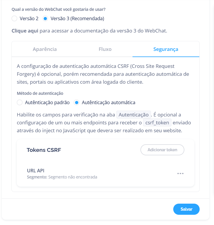 A configuração de segurança do WebChat oferece dois métodos de autenticação:Autenticação Padrão e Autenticação Automática (CSRF).