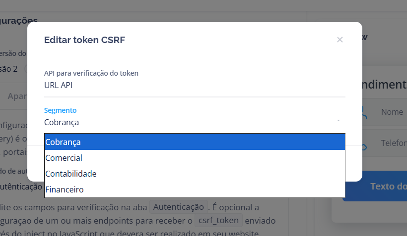 É possível inserir ou editar a URL da API responsável pela validação do token, garantindo que a autenticação automática seja realizada corretamente.