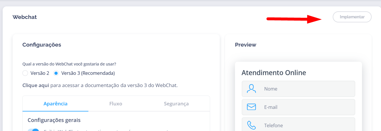 Após a finalização da configuração, ao optar porSalvar ou Implementar, será gerado um script de integração do WebChat, que deve ser inserido no código do site para ativar o chat.