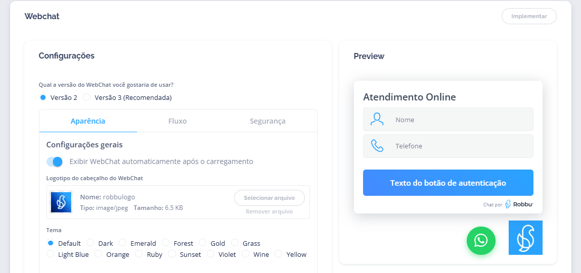 Na personalização do WebChat, é possível selecionar o tema visual desejado para adequar o layout à identidade visual da empresa.