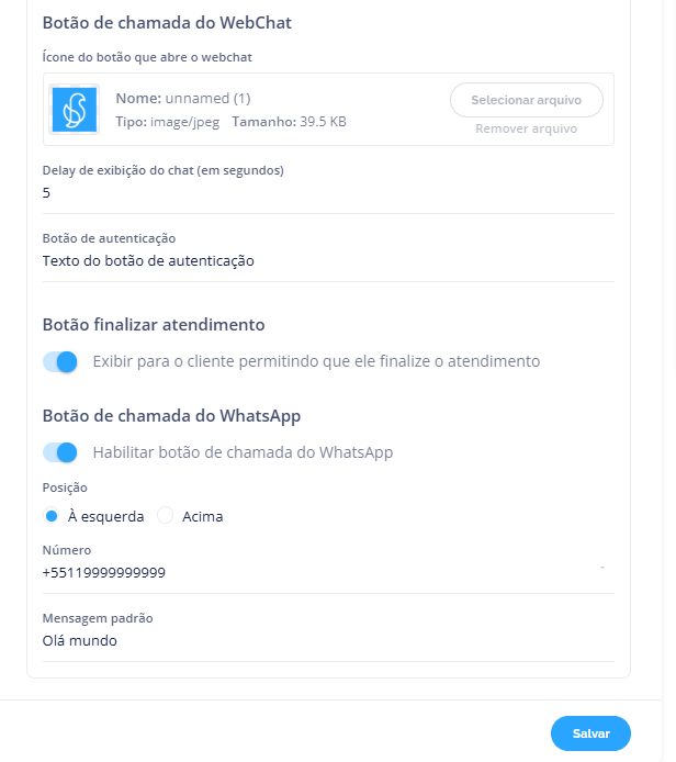 Observação: Se o texto do botão de autenticação não for definido, o sistema exibirá por padrão a mensagem “Iniciar Atendimento”.
