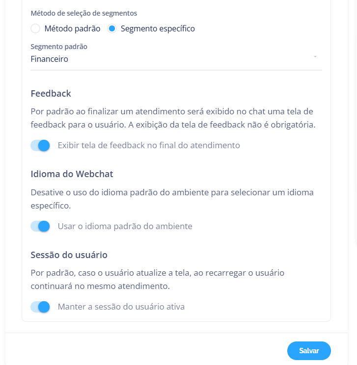 A configuração de método de seleção de segmento define como o contato será direcionado ao iniciar o chat.