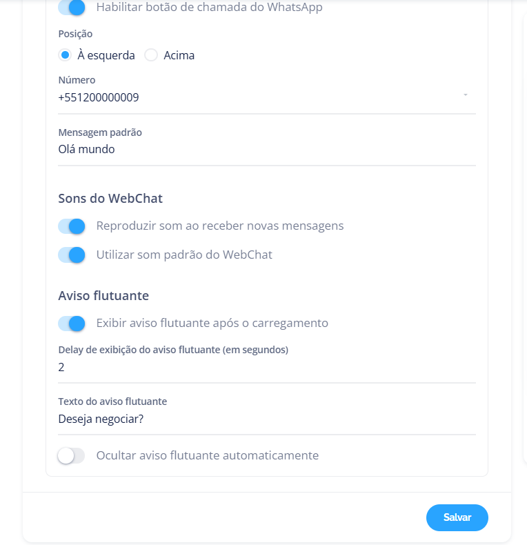 Aviso flutuante: Exibe uma mensagem automática após o carregamento do chat, podendo configurar o tempo de exibição (em segundos), o texto exibido e a opção para ocultar o aviso automaticamente.