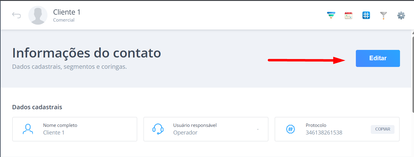 A criação de agendamentos é feita a partir da opção Editar, localizada na tela do contato.
