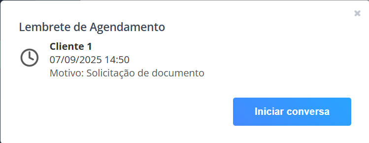 Sim. O sistema envia uma notificação automática com um botão “Iniciar Conversa” quando o horário do agendamento estiver próximo.