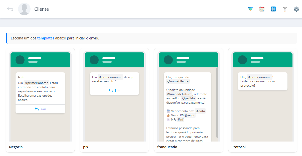 - Antes do envio, verifique se todas as variáveis do template estão devidamente preenchidas no perfil do contato.