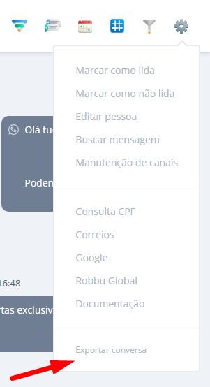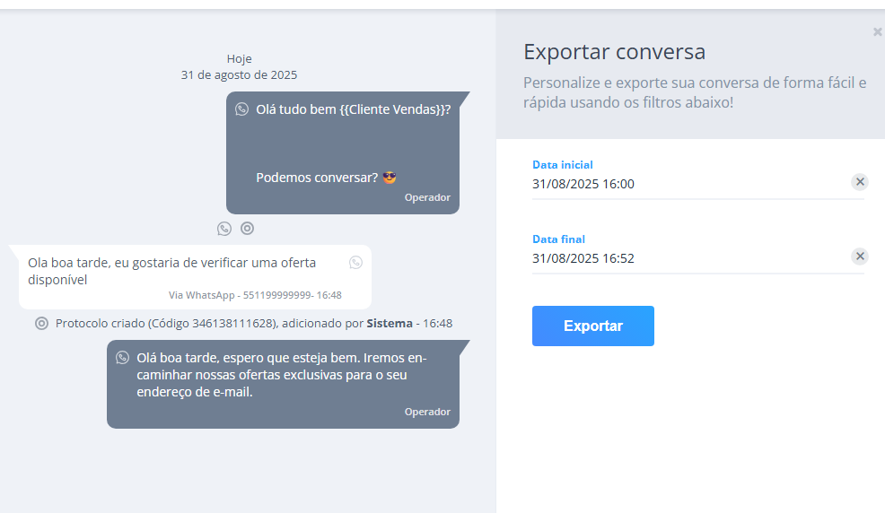 Após a confirmação, o sistema irá gerar um arquivo com o histórico da conversa do período selecionado.- O arquivo estará disponível para download