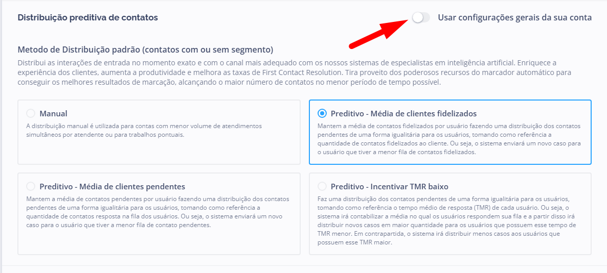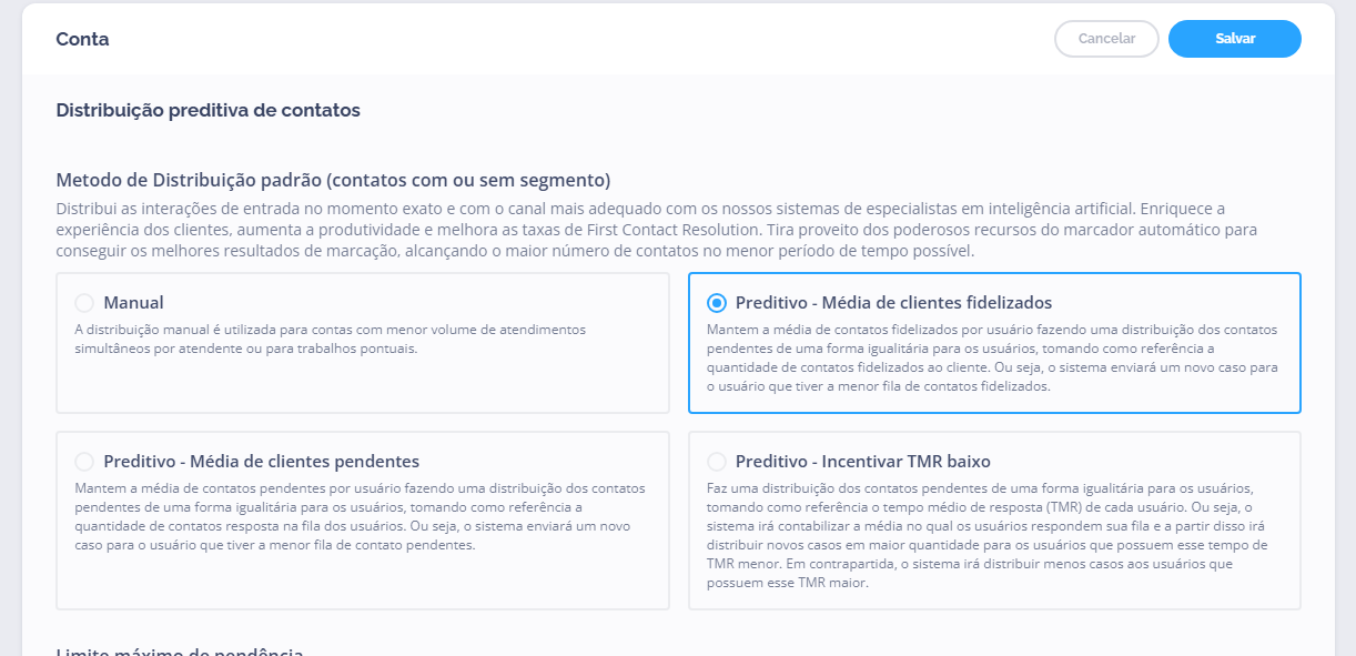 A Distribuição Preditiva foi projetada para maximizar eficiência em ambientes de alto volume, automatizando o envio de contatos para os operadores mais adequados conforme critérios inteligentes predefinidos.Configurações interligadas com esse método de distribuição